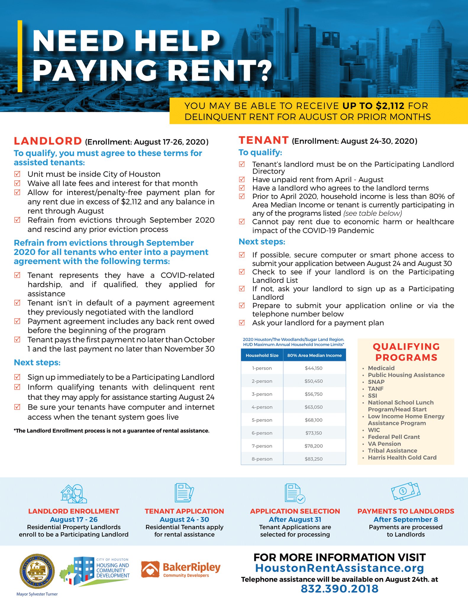 We provide listings of local and state government faith-based and non-profit rental assistance programs. The Harris County Recovery Assistance program provides a one. Must have a W9 from your landlord apartment manager or mortgage.
